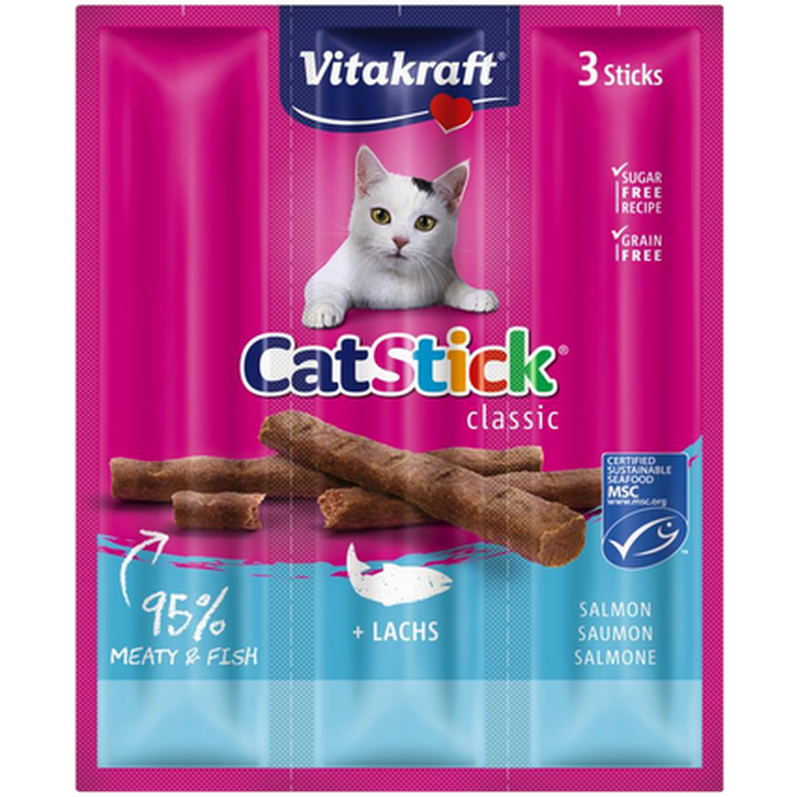 Vår bäst säljande produkt! Vitakraft Cat-stick mini otroligt goda köttrika sticks i 3-pack. Ett populärt kattgodis i form av tuggpinnar, kan brytas av i mindre bitar eller ges som hel pinne. Detta är ett godis som de flesta kräsna katter brukar älska!