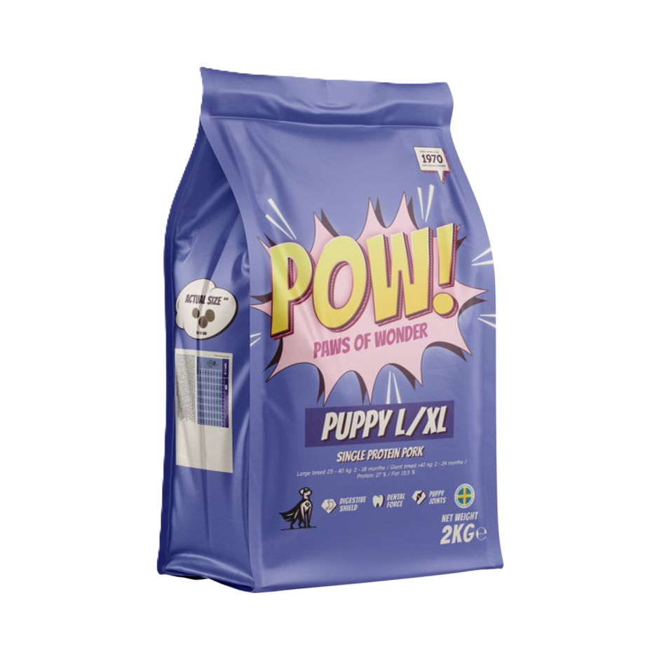 Laddad med superkrafter för små valpar. Ger extra energi för alla blivande superhjältar! POW! Dog Puppy Small/Medium Pork är ett komplett helfoder för valpar av små och medelstora raser. Med fläsk som proteinkälla och en energirik sammansättning får valpen den näring den behöver för att växa, utvecklas och hålla jämna steg med vardagens alla äventyr. Speciellt anpassat för valpar av små och medelstora hundraser. Innehåller fläsk som ett välsmakande och näringsrikt protein. Energirik sammansättning som stödjer valpens snabba tillväxt. Bidrar till utveckling av muskler, leder och skelett. Ger valpen kraft och energi för en aktiv start i livet. Ge din valp rätt näring från början med POW! Dog Puppy Small/Medium Pork – optimalt foder för framtidens små superhjältar.