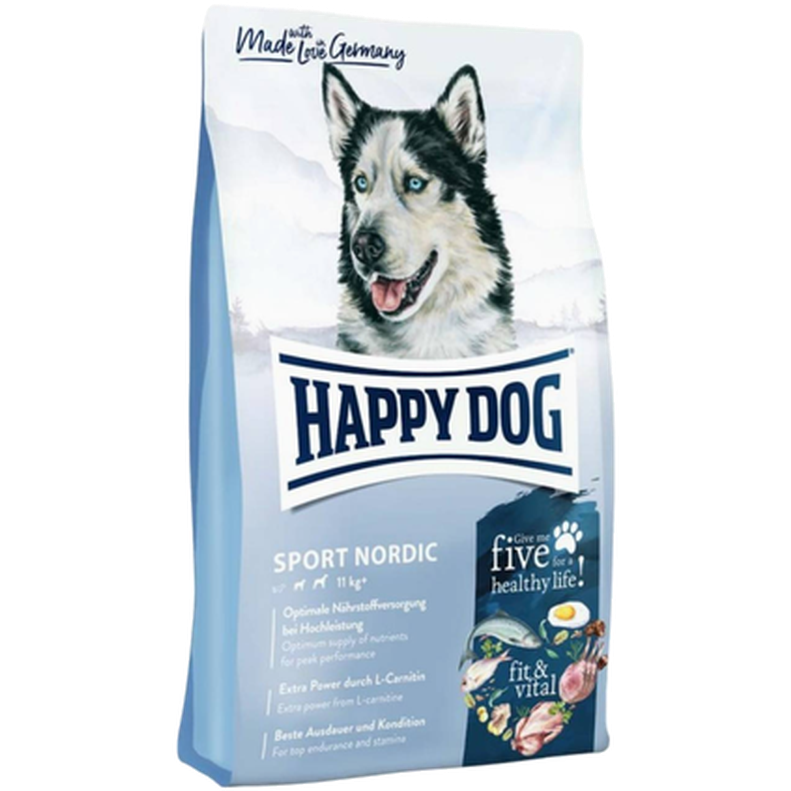 Happy Dog torrfoder Sport Nordic med kött, fisk & inälvor för vuxna hundraser i alla storlekar. Komplett balanserat hundfoder med högt energiinnehåll för hårt arbetande hundar i vuxen ålder. Hundmat som främjar uthållighet, stycka & bästa prestation. Lättsmält proteinvariation med både nyzeeländsk mussla & extra kraft från L-karnitin i torrmaten. HappyDog Medium Fit & Vital Adult Sport Nordic 28/20