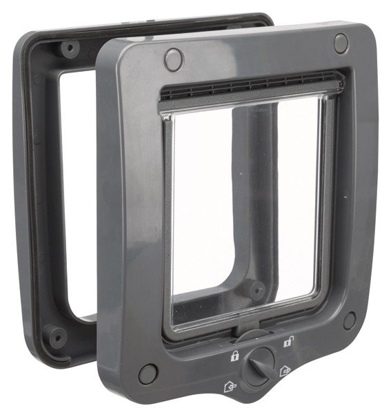<strong>Kattlucka med in- och utgång.</strong><br><br>Klassisk kattlucka i grå färg med 4 olika lås-lägen, så kallad 4-vägs kattlucka. Tillverkad i plast med en mjukstängande, transparant svänglucka. Kattluckan har TPR-gummi som en list runt hela öppningen, samt ett magnetlås som gör att svängluckan inte slår i vinden.<br><br>4-vägslås betyder att denna kattlucka kan vara:<ul><li>helt öppen för in- och utgång</li><li>helt låst, både för in- och utgång</li><li>endast öppen för ingång (men ej utpassering)</li><li>endast öppen för utgång (men ej inpassering)</li></ul><br>Förlängningstunnlar går att köpa till vid behov (för montering i tjockare dörr eller vägg).<br><br><strong>Storlek:</strong><br>Totala mått: 20 x 22 cm<br>Cut out size/urtagning: 15,9 × 16,8 cm<br>Storlek lucka: 14 × 15,5 cm<br>Minsta installationsdjup: 15 mm<br><em>"Weatherproof refers to the UV-resistance as well as the durability at sub-zero temperatures of the material of the product. When purchasing a cat flap, it should always be considered that it is also a cold bridge."</em>