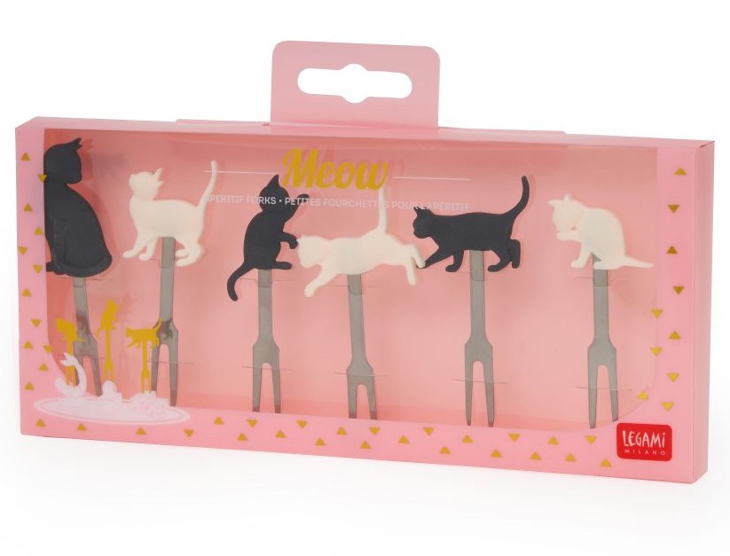 <strong style="font-size:1em">Fina aperitifgafflar med kattmotiv</strong>Söta små gafflar, helt perfekta för frukt, oliver, ostbrickan, snacks och plockmat när du ska bjuda dina vänner på lite gott! 3 vita och 3 svarta katter pryder dessa bestick.<br /><br /><strong>Storlek:</strong> ca 3,4 x ca 9 cm