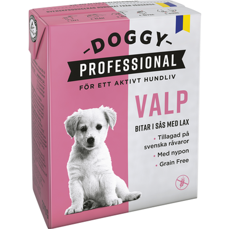 Svensk valpmat - Hundfoder för valpar med bitar i sås med lax, ett våtfoder tillagat på svenska råvaror. Blötfoder med naturliga ingredienser & utan onödiga tillsatser, för hundvalpar. Doggy Professional Valp bitar i sås med lax innehåller nypon som är rika på antioxidanter, fritt från spannmål och utan tillsatt socker. Allt för din valps bästa. Doggy Professional Paté Valp 370g